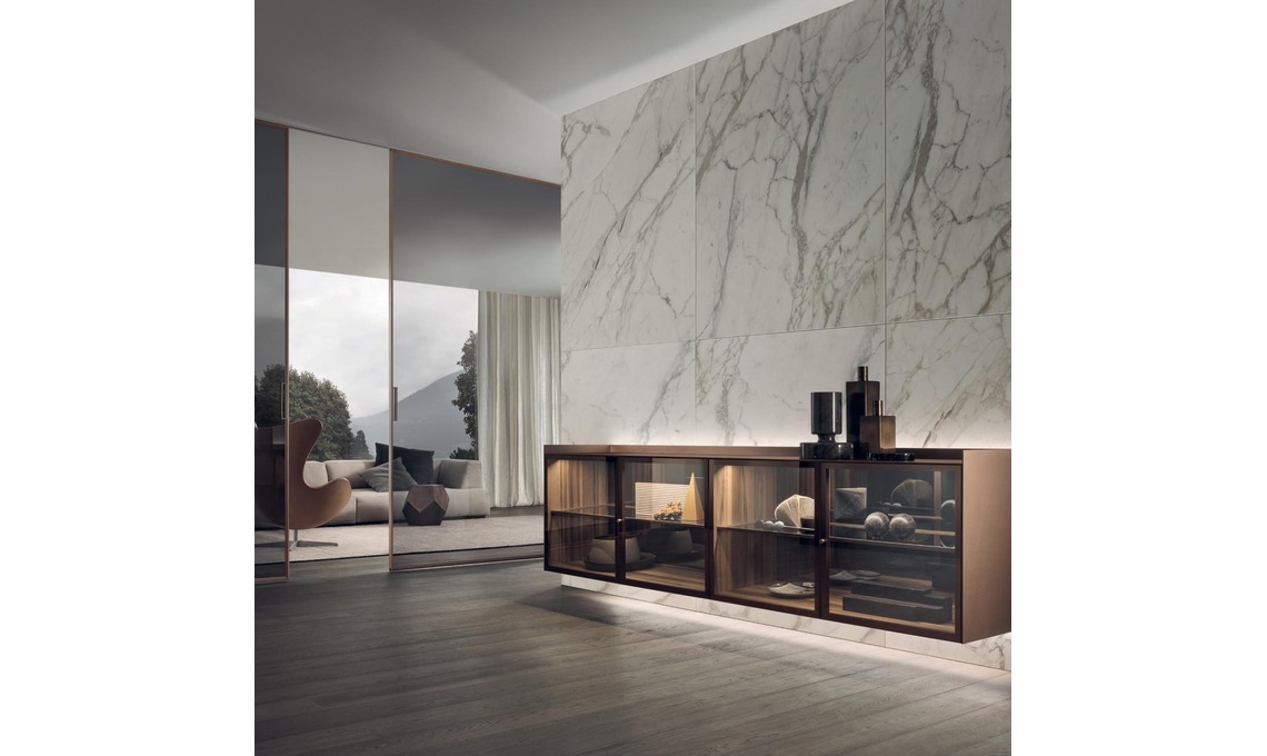 La palette ‘caldo&freddo’ asseconda arredi spaziosi dai riflessi lucenti che, abbracciando lo spazio senza incupirlo, invitano a mettere in pausa lo stress.