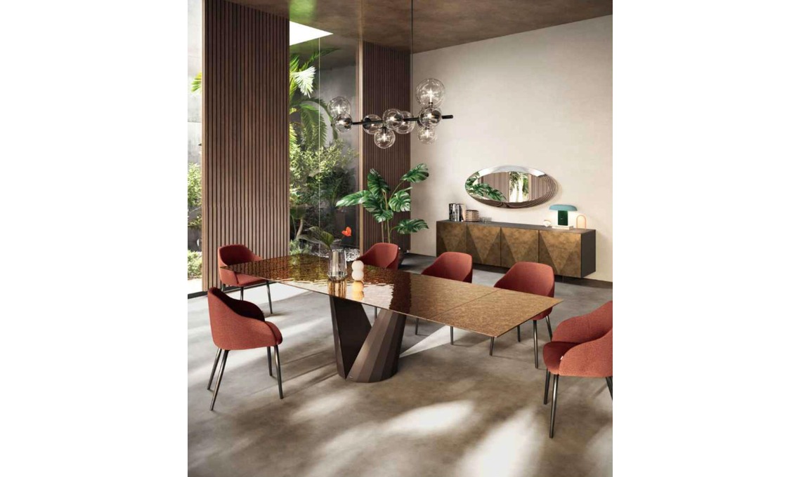 Tavolo allungabile Valencia con base e gambe in metallo verniciato Bronzo e top in vetro Ricotto Ambra finitura Bocciardata [Scavolini cm 200/290x100x72h].