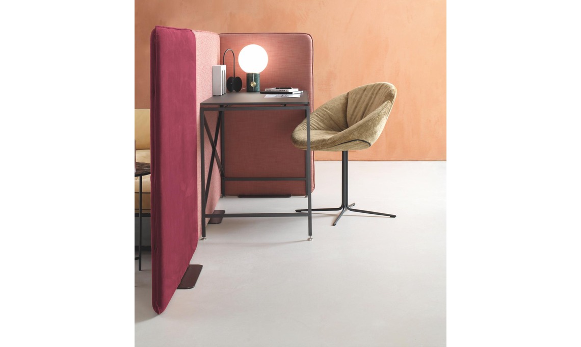 Pannelli divisori Labyrinth, qui rivestiti con i tessuti Smack S09 e Creta C24 [Zalf, cm 250x69x112h].