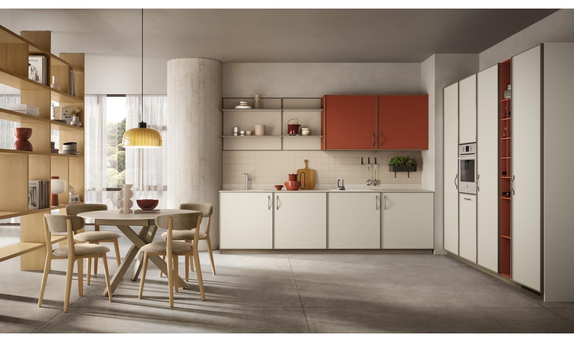 Questa cucina è Jeometrica di [Scavolini] con ante di basi e colonne in Decorativo Bianco Puro più ante dei pensili in Decorativo Paprika su telaio Titanio e maniglie in metallo finitura Titanio; top in Abitum Grès Pietra Avorio, accanto ai pensili, mensole con schienale in Decorativo Macaron con profilo in Alluminio Titanio. Tavolo Hover abbinato a sedie Pin.