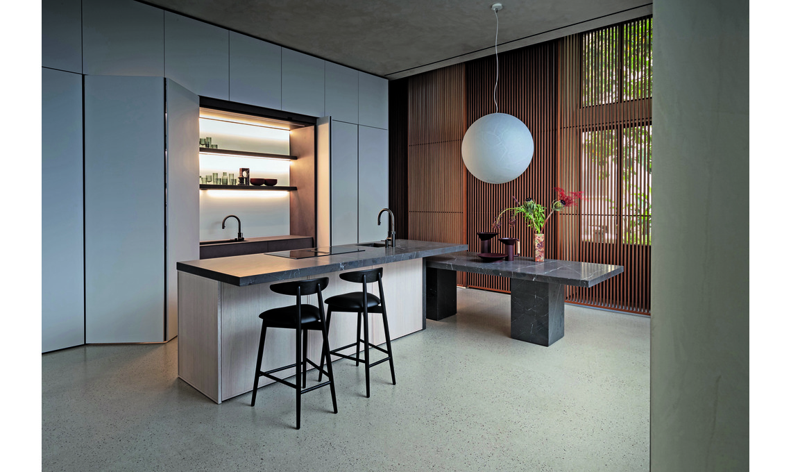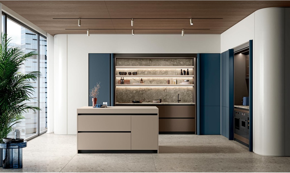 Questa cucina è Palio di [Stosa] con basi dalle ante in laccato opaco finitura Pomice e in laccato opaco finitura Blu Storm per l’isola; piano di lavoro in Neolith® finitura Everest Sunrise Silk con lavello integrato. Pensili e colonne modello Metropolis in termostrutturato finitura Noce Eucalipto; boiserie Linea laccato opaco Pomice e alluminio finitura nero.