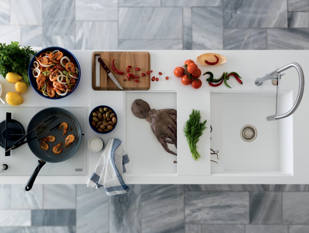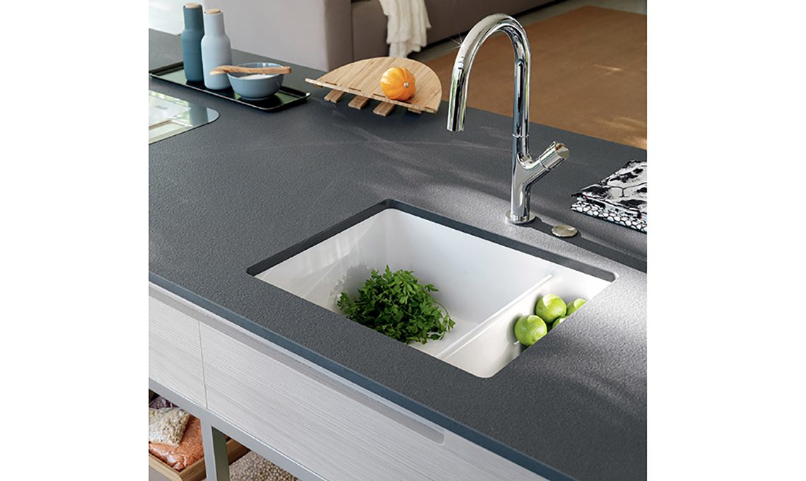 QUARTZ surface: come dice il nome, è a base di quarzo (uno dei materiali più duri al mondo) del quale vanta tutte le proprietà: impermeabile, resistente alle macchie (caffè, vino, olio di oliva, succo di limone, trucco…), agli acidi e agli urti, garantisce massima igiene [Franke].