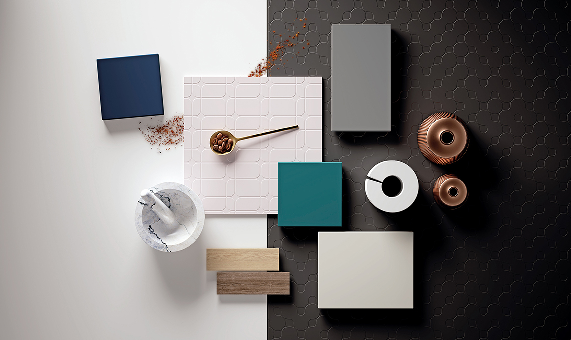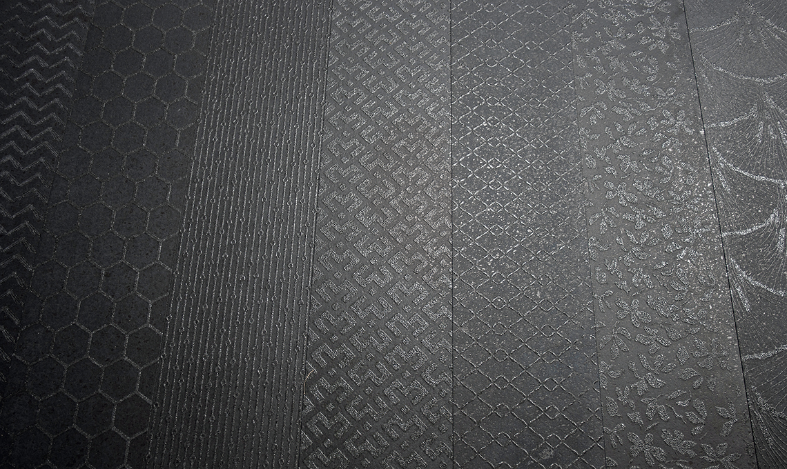 PIETRA LAVICA: è un materiale naturale di origine vulcanica, vetrificato in superficie con una sottilissima polvere di vetro riciclato (che nella collezione Tessuti crea decori 3D), così da renderlo ancora più durevole, antiusura e resistente agli sbalzi termici [NeroSicilia].