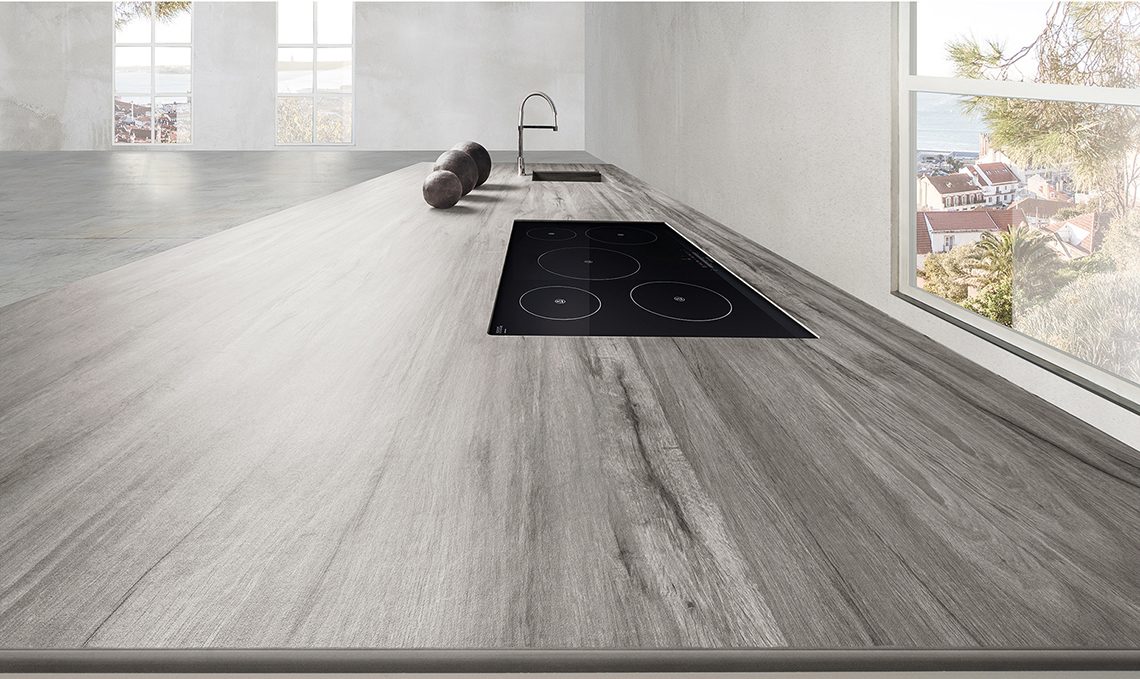 LAMINAM®: è una lastra sottile (da mm 12) in materiale ceramico ad alte prestazioni, che riproduce la texture di altri materiali. È igienico, antibatterico e resiste a macchie, calore, graffi e abrasioni [Laminam].