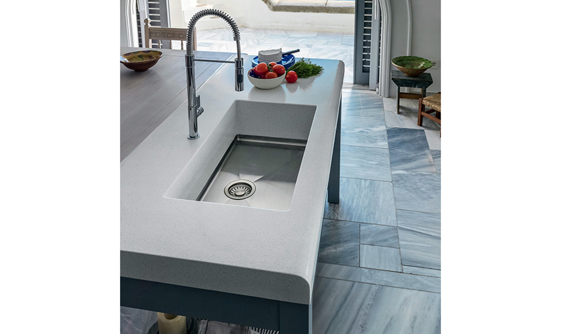 OKITE®: miscela a base di quarzo fino al 93% con resina poliestere e pigmenti naturali: il risultato è un materiale solido (5 volte più forte del marmo e del granito) dalla superficie non porosa, per questo igienica e sicura. Resiste a graffi, calore, tagli e macchie difficili, anche di sostanze acide. In lastre da cm 140x306, spessore da 1,3 a 3 cm [Okite].