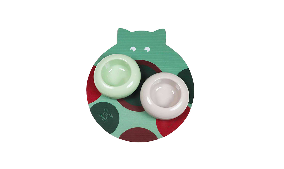 • Cat Food Kit Basic è un allegro e pratico kit per servire il pasto al proprio gatto. Firmato da United Pets, è composto da un tappetino idrorepellente, che consente di mantenere pulito il pavimento, e due ciotole in polipropilene 2nd life ad uso alimentare.