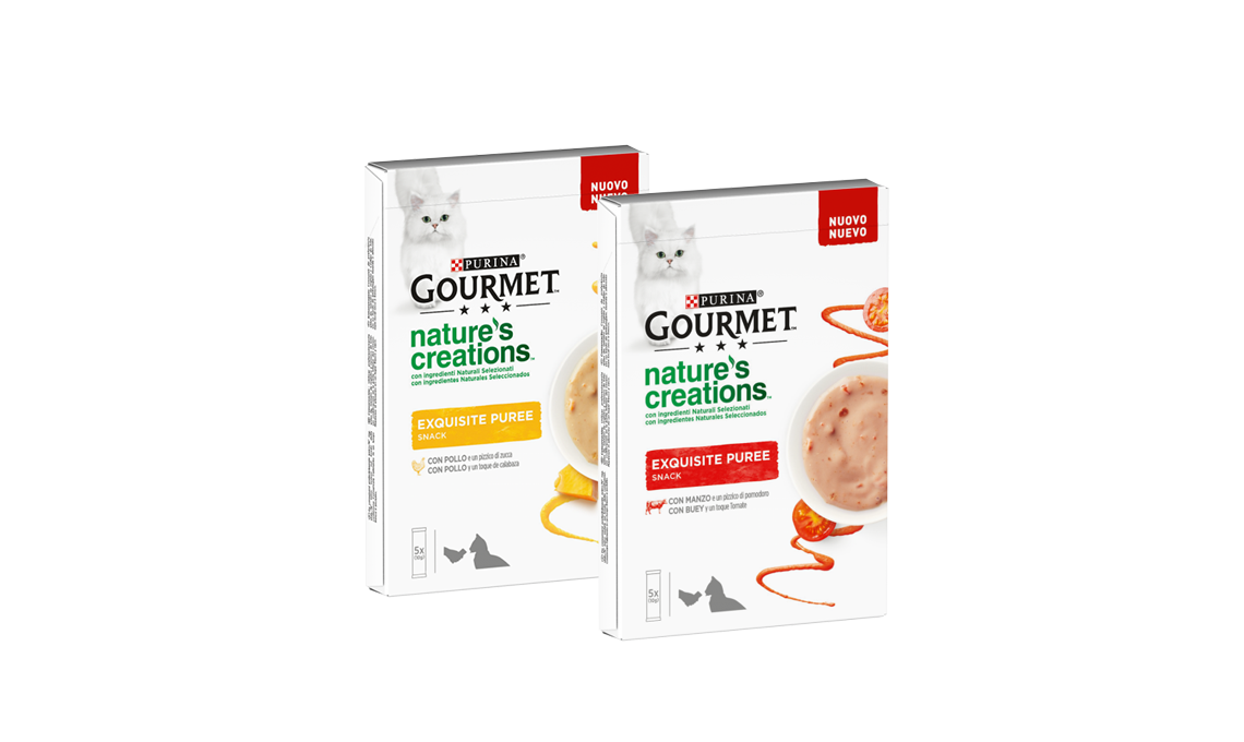 • Gourmet Nature's creations Exquisite Puree di Purina è una golosità pronta per essere servita nella ciotola o dalla bustina, per condividere momenti di piacere insieme al tuo gatto.