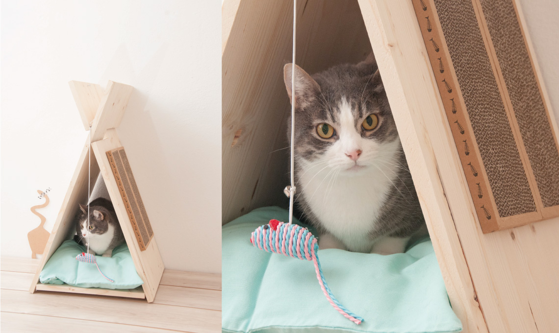 - Per finire, incolla il tiragraffi su uno dei due lati e posiziona il cuscino all’interno della capanna. Se vuoi puoi appendere anche dei giochi per il tuo gatto.