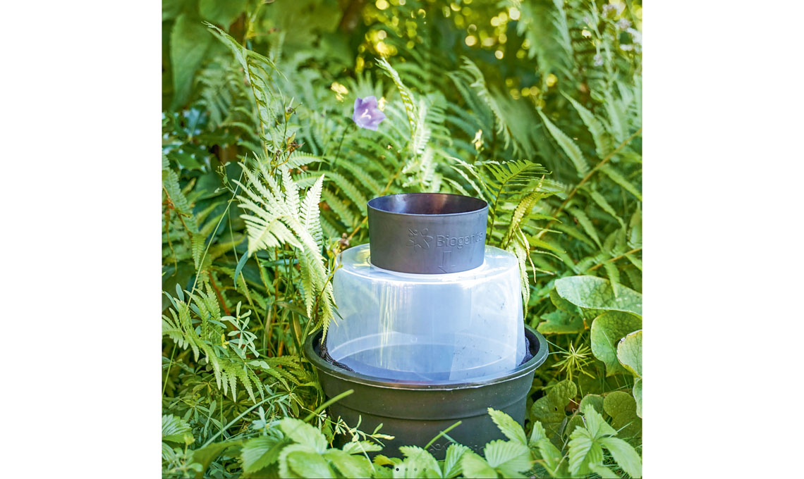 La trappola BG-Gat è un eco-dispositivo per aree verdi che simula un habitat umido per attirare e catturare le zanzare che cercano un posto dove deporre le loro uova [Biogents, ø cm 26x38,5h]