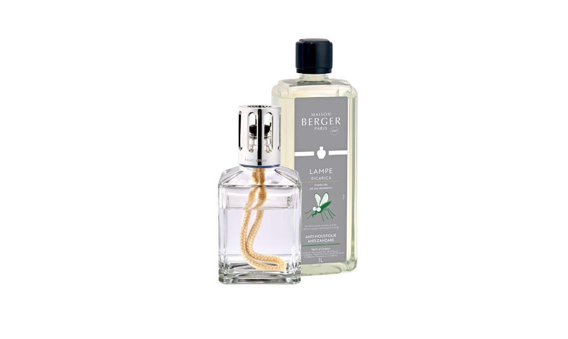 La lampada catalitica. Grazie alla soluzione profumata Antizanzare Vent d’Océan, la lampada a combustione catalitica Cube Essentielle allontana le zanzare con efficacia provata per 8 ore. In casa protegge 12 mq, all’esterno un raggio di 2 m [Maison Berger Paris]