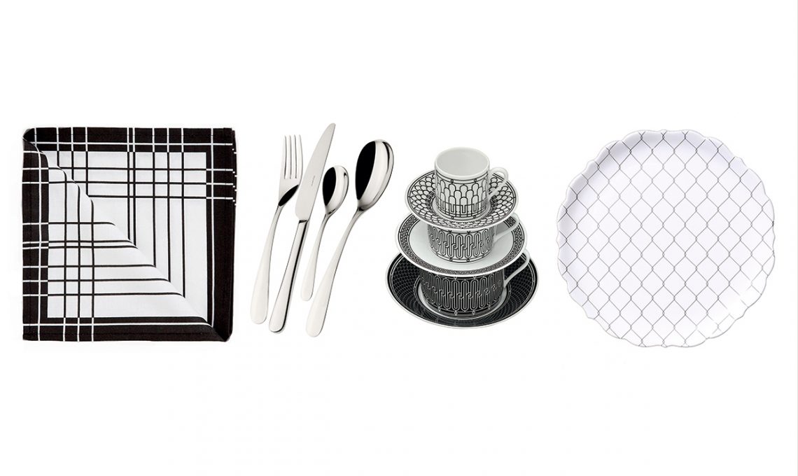 Un incrocio di linee sul tovagliolo in cotone [Zara Home, cm 45x45 €11,99 il set da 4]. Design morbido per le posate in acciaio Primula [Bugatti, da €6,50 il cucchiaino]. Raffinate con il logo-icona, le tazze H Decò [Hermès, da €94 la tazzina da caffè]. Decoro a filo platino nel vassoio in porcellana Grillage [Faiencerie Georges €40].