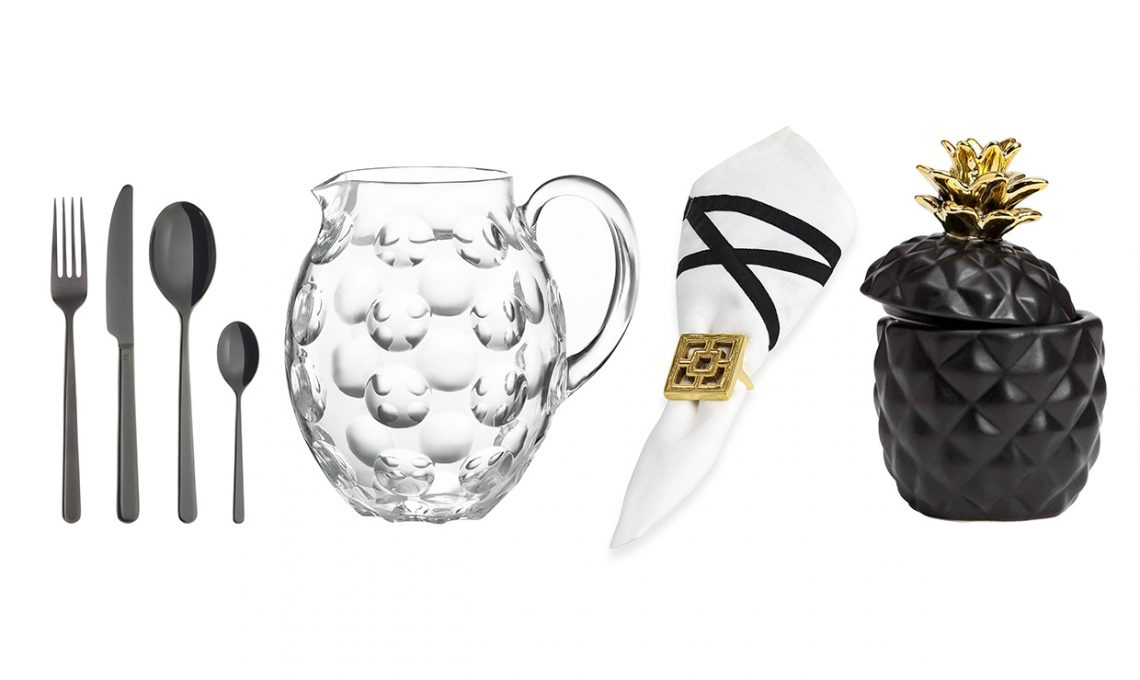 Versione black per le posate rigorose in acciaio inox Linear [Sambonet, da €18,50 la forchetta]. Ha una lavorazione geometrica la caraffa in materiale plastico Venice [Guzzini €39]. Il portatovagliolo è come un gioiello in ottone lavorato a mano [Jonathan Adler, €120 il set da 4 e €22 il tovagliolo]. Quel tocco in più per creare l’atmosfera è la candela in vasetto di ceramica a forma di ananas [H&M €5,99].