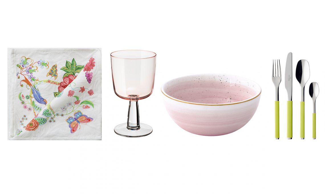 Un giardino incantato sul tovagliolo in lino [Zara Home, cm 45x45 €22,99 il set da 4]. Rosa delicato per il calice in vetro Intagande [Ikea €2,99]. Artigianale e rifinita con un sottile bordo oro la ciotola in porcellana Artesanal [Easy Life da €7]. Nella brillante versione verde kiwi il servizio di posate in acciaio e silicone [Villeroy & Boch €109 il servizio da 6 posti tavola].