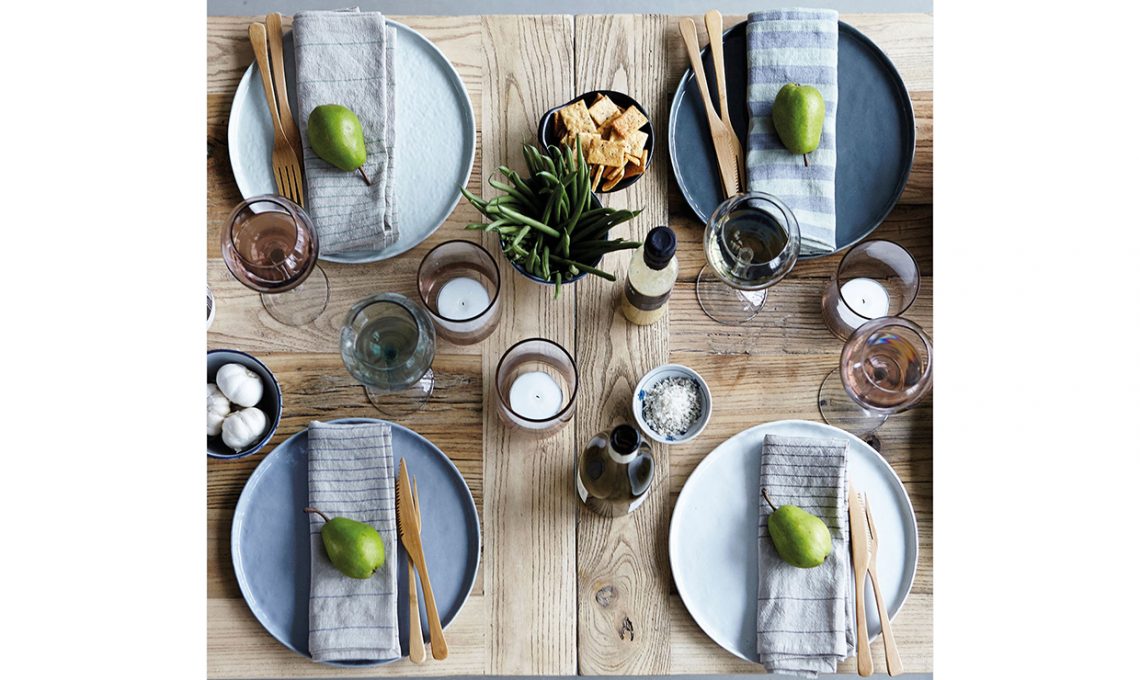 Questa mise en place con piatti artigianali, lino e vetro racconta la voglia di cose autentiche e di pranzi all’aria aperta [House Doctor, da €58 il servizio da 6 bicchieri e da €11,95 il piatto].