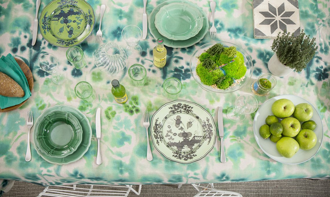 La tovaglia è realizzata con il tessuto Majolica - Strato - Emerald [Designers Guild], piatti verdi [Ceramiche Fasano da Funky Table] e decorati Oriente Italiano [Richard Ginori], posate Ginevra Vintage [Mepra], bicchieri Fish&Fish [Serax], calici Glass [Bitossi Home], cementina [All’Origine], caraffa [Paola C], centrotavola con terrario [TerrariumArt].
