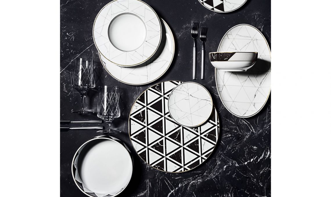 Una tavola che combina l’effetto naturale del marmo con i motivi geometrici del servizio in porcellana Carrara [Vista Alegre, da €16,40 il piatto pane].