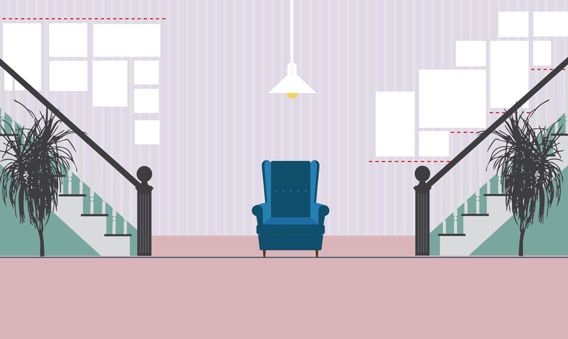 Oppure immaginare una linea parallela al soffitto e disporre le cornici come se "scendessero" dal soffitto in modo ordinato.