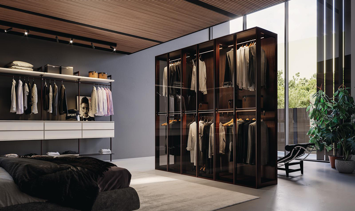 con maniglie integrate nella finitura Brown, 6 ante a battente e 2 spalle laterali in Vetro Reflex, più interni nella finitura Teak [Giessegi, cm 277x61x 262h, prezzo su progetto].