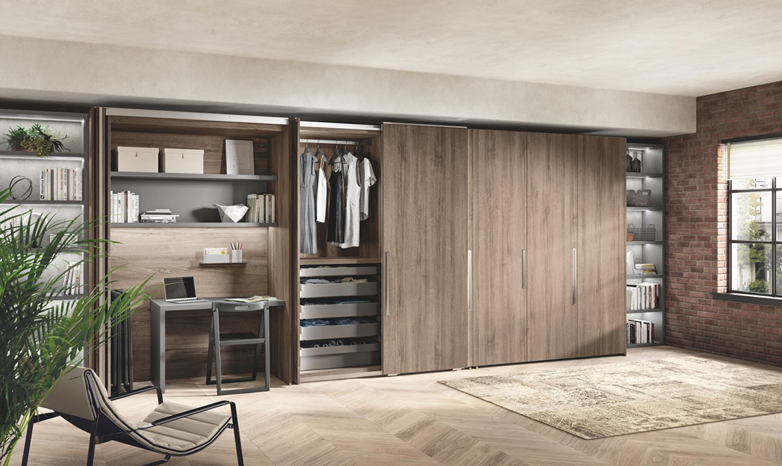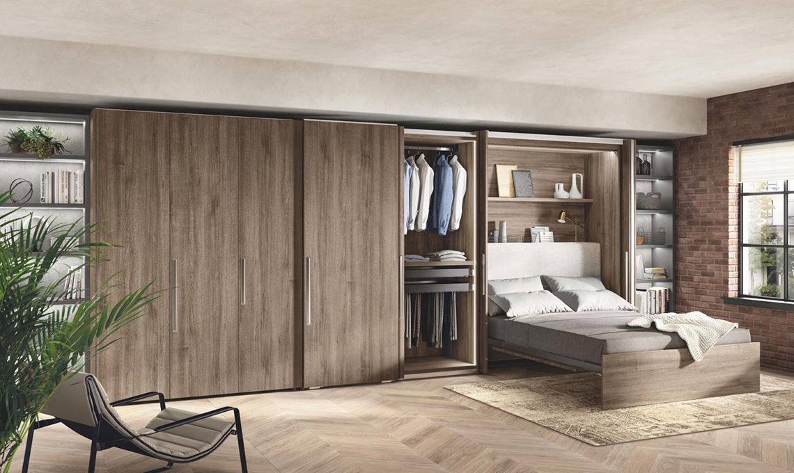 Studiati per i loft (ma perfetti anche nei monolocali) dove scarseggiano i metri quadri, i sistemi multitasking integrano più funzioni a scomparsa, che si trasformano in un attimo in ciò che serve. Dietro le ante delle pannellature, si celano insospettabili funzioni, per ogni esigenza. Il modulo guardaroba accessoriato con tubi appendiabiti e cassetti e l'angolo studio per la DAD e lo smart working. Infine una zona notte con letto a scomparsa e ripiani pronti all’uso!