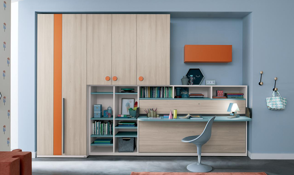 La parete con moduli pensili composizione 080 integra libreria, scrittoio estraibile e letto a scomparsa. Struttura in finitura Bianco e Paprika, frontali Ambra e Paprika e ripiani Nuvola [Doimo Cityline]. Potrai organizzare il guardaroba con ripiani e appenderia ma usarlo anche come archivio per i documenti di casa e le carte di lavoro. Con un gesto la scrivania scompare, lasciando il posto al letto per gli ospiti.