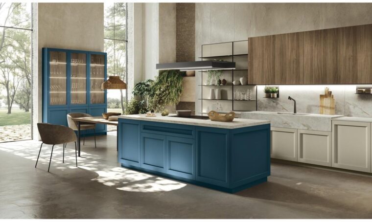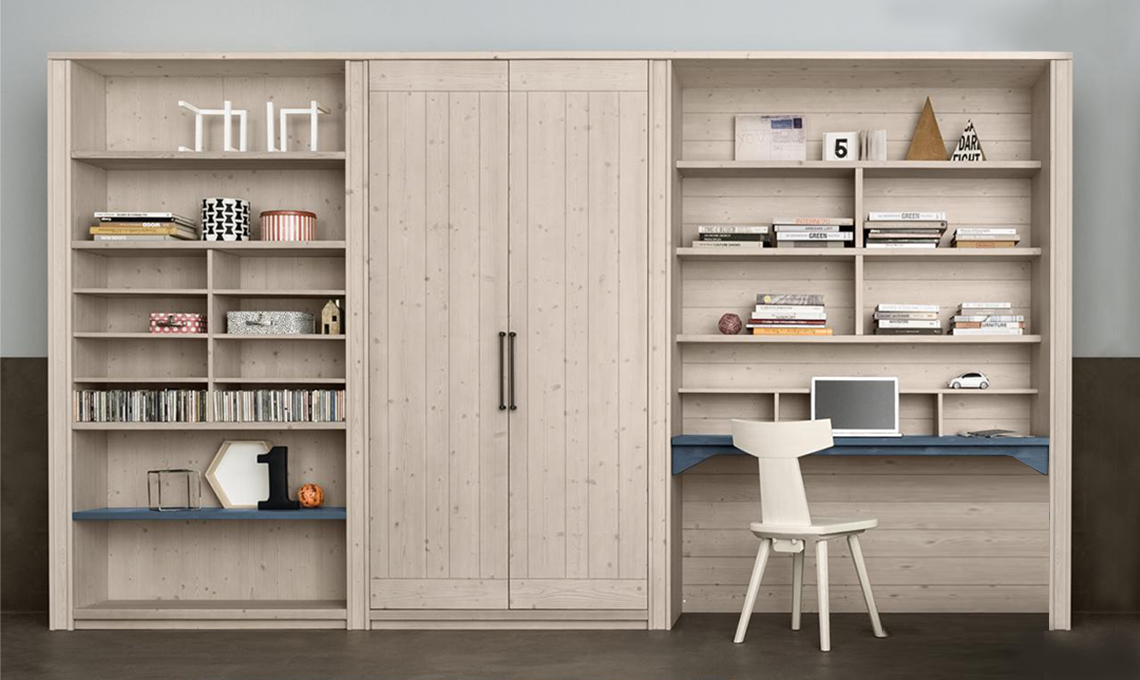 in legno massello con ante, Mia presenta sia una zona studio con scrittoio Blu Cobalto e mensole in finitura Canapa, sia scomparti a giorno realizzati con mensole in finitura Canapa [Scandola, cm 340x60x245h € 6.529].