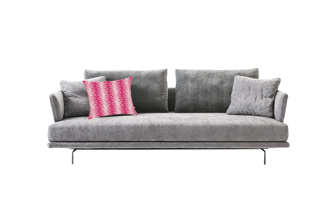 Linee rigorose per il divano Quinta Strada [Saba Italia, cm 238x95x90h]; sartoriale il cuscino con tessuto Tree Fern Weave di Sanderson [Your Stylish Home, cm 50x50]
