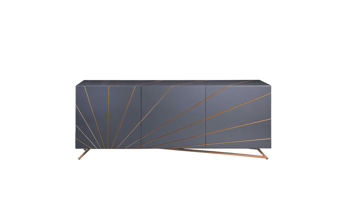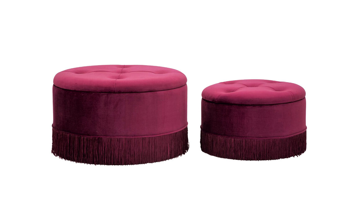 Non può dunque mancare un divano sartoriale, rigoroso, abbinato a un elegante pouf colorato con le frange e a una madia di design.