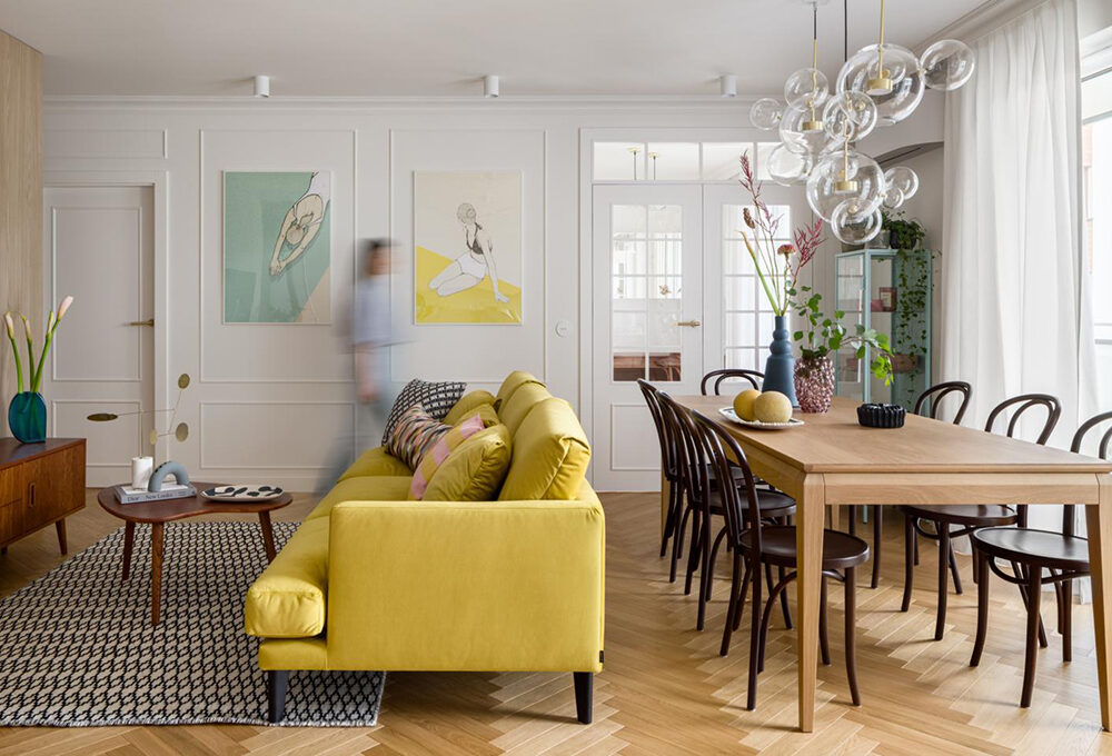 Un interno che mixa classico e pop: possibile? Con i giusti elementi l'equilibrio sarà perfetto! La sedia-icona danese, un divano tessile (giallo!), il tavolo nordico e il lampadario stile Déco rendono speciale (ma anche normale) la cucina bubble gum!