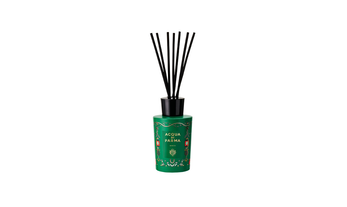 Diffonde nell’aria l’aroma di una passeggiata tra le montagne il diffusore Bosco, racchiuso nel flacone natalizio [Acqua di Parma]