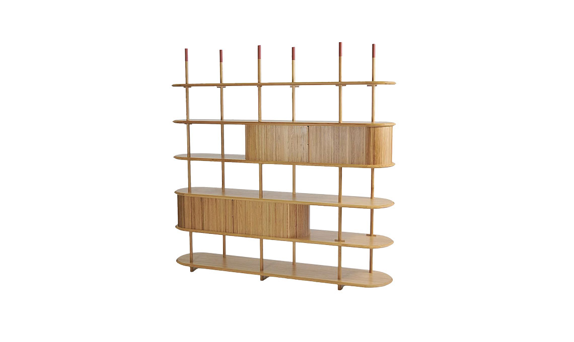 Una ‘leggera’ libreria passante in rovere per dividere gli ambienti del living. Poi, divano e tavolino minimal, tessuti caldi e accessori materici