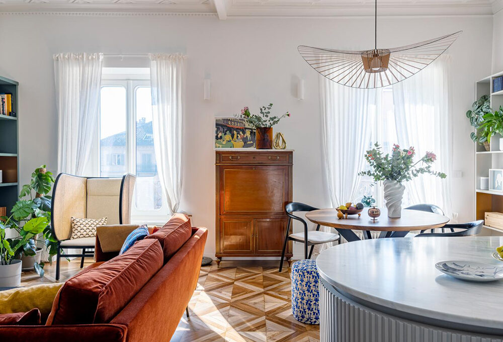 Non sottovalutare l’impatto che giocano le superfici insieme al design: il velluto del divano, il marmo del tavolo, gli intrecci della lampada e della poltrona...