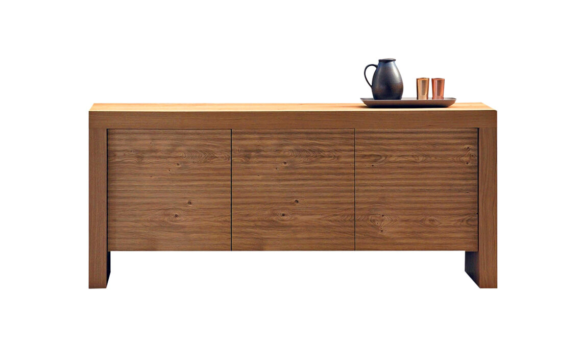 In tamburato di abete e rovere nodato la madia T-Wood [Riflessi, cm 185x50x81h € 2.415].