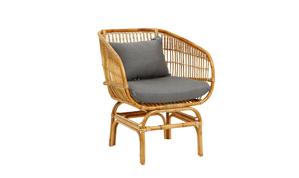 In rattan la poltrona artigianale da esterno Bali con cuscini in tessuto tecnico [Nordal, cm 75x68x81h € 455].