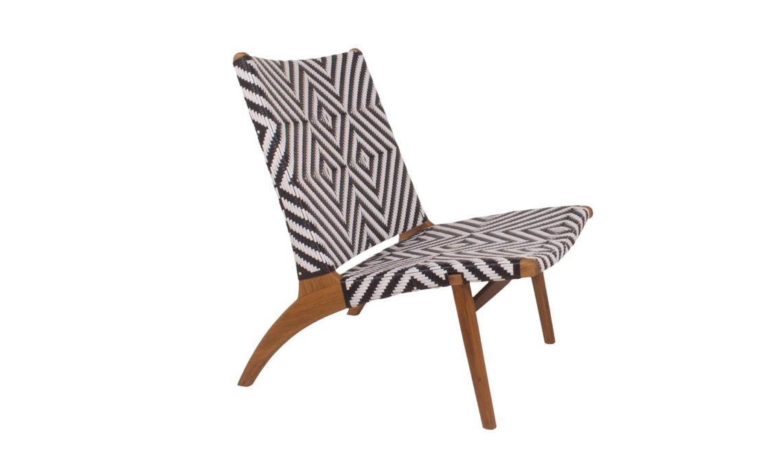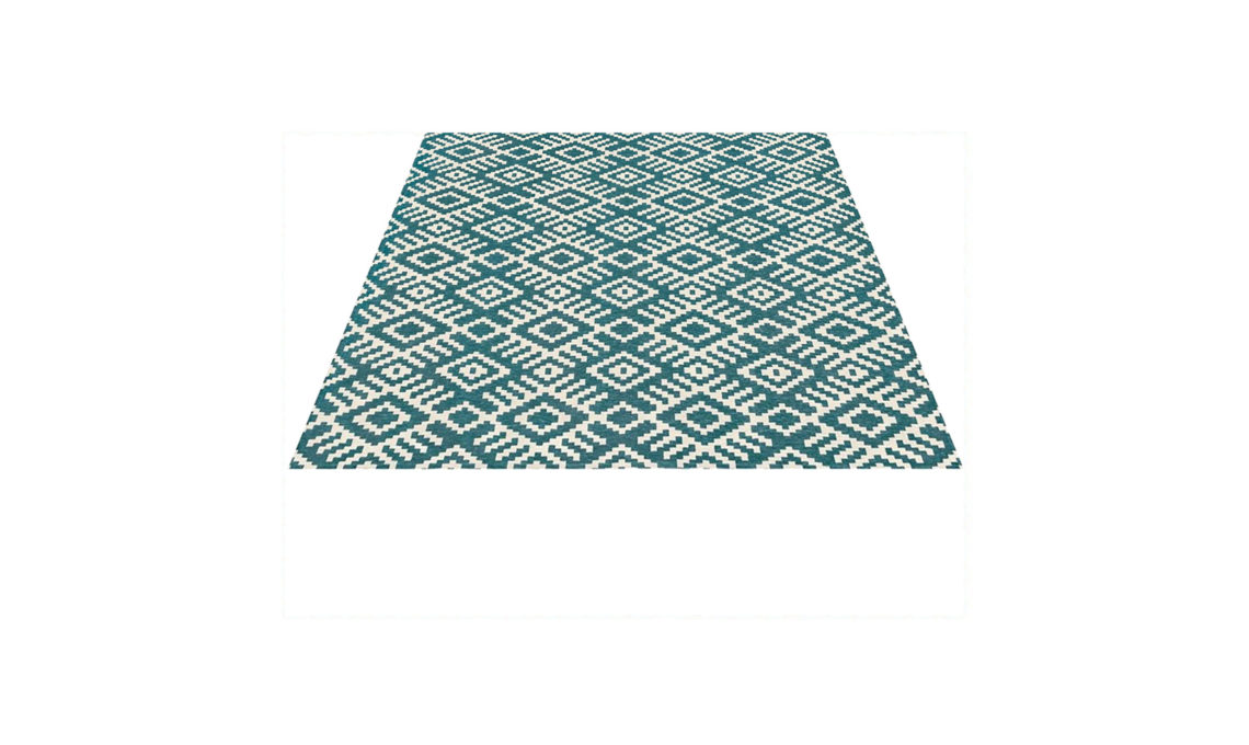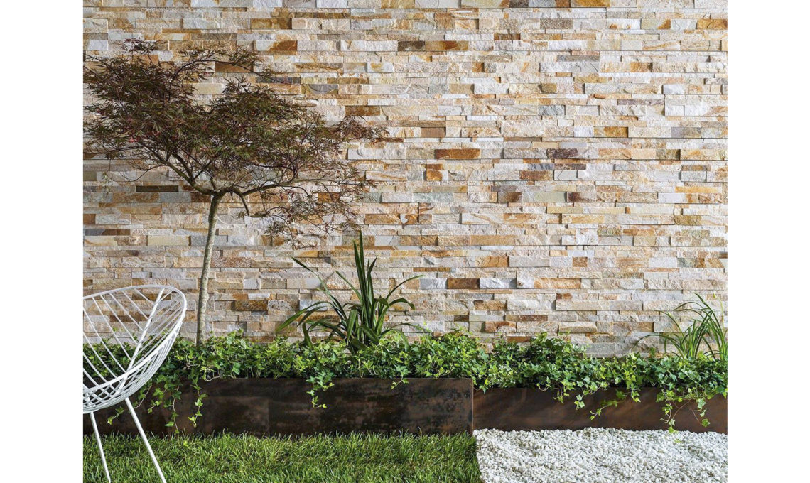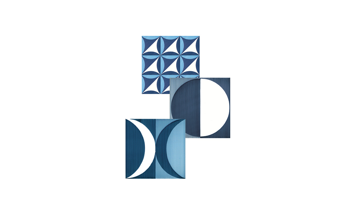 Gioca sui contrasti e abbina la grafica rigorosa in bianco e azzurro con la pietra dalla superficie irregolare.