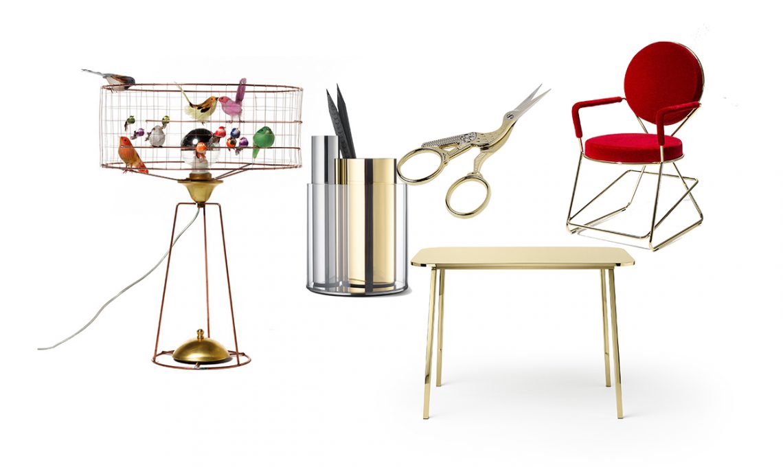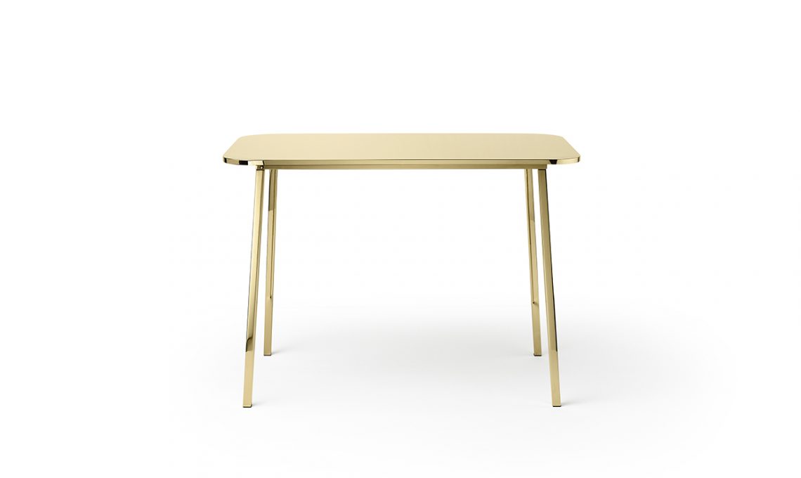 Scrivania Miami con finitura ottone lucido [Ghidini 1961, cm 105x60x75h prezzo su richiesta].