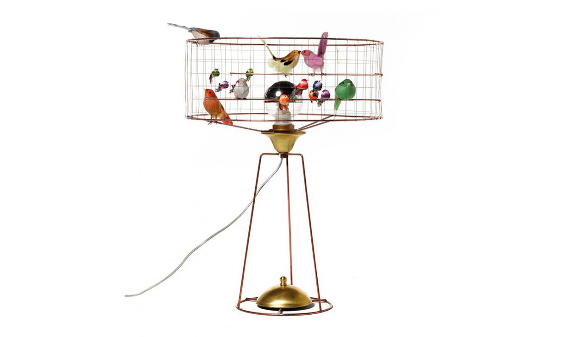 Per una scrivania glamour la lampada da tavolo Volière con rete in rame metallizzato e uccellini multicolore [Mathieu Challières, cm 38x55h €371 » smallable.com].