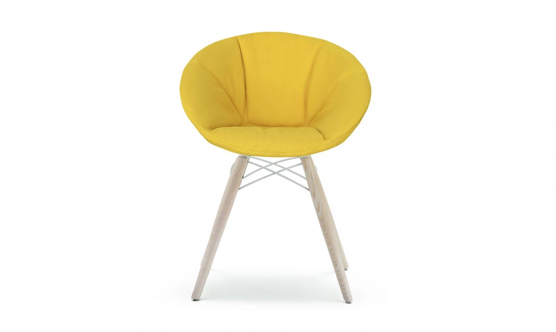 Sedia-poltroncina Gliss con gambe in legno e imbottitura sfoderabile applicabile sulla scocca per essere più comodi [Pedrali, con vestina da €555].