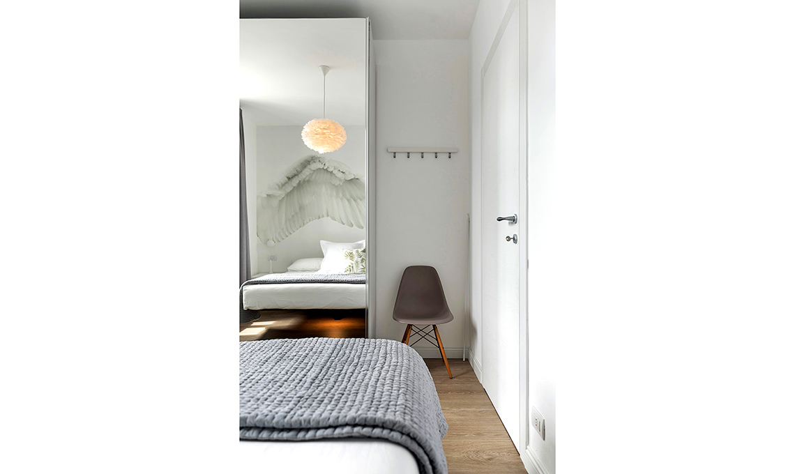 Una sedia di A design è perfetta! Letto sospeso Fluttua [Lago], carta da parati White Angel [Wall&Decò], lampada Eos XL con piume [Umage, ø cm 75 € 399].