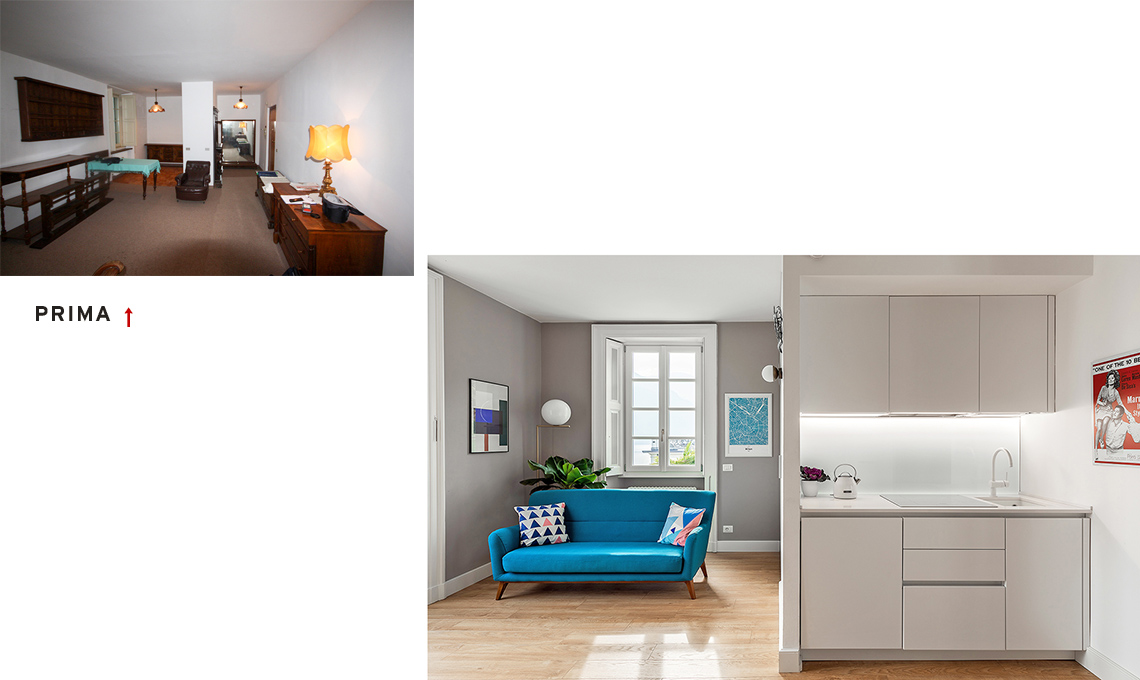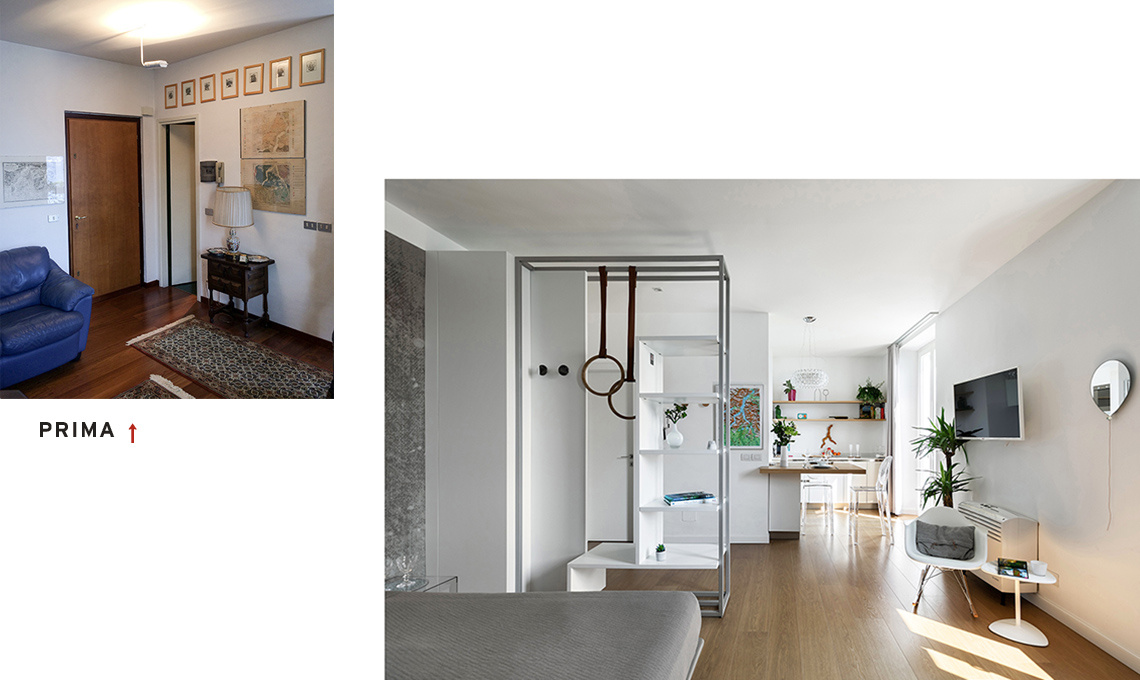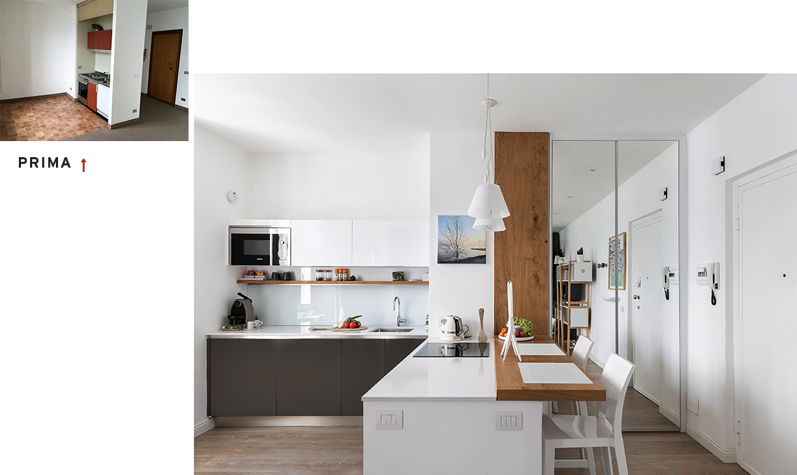 DIVIDERE GLI SPAZI Prima la cucina faceva da filtro all’ingresso, togliendo tanta luce alla stanza. Ora l’isola con bancone snack divide lasciando entrare la luce. I pensili chiari e la mensola alleggeriscono visivamente e il paraschizzi in vetro riflette e moltiplica la luce. L’effetto? Luminoso e accogliente, due punti vincenti se vuoi affittare.