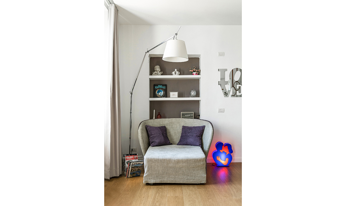 IL DETTAGLIO IN PIÙ La lampada-scultura di Marco Lodola aggiunge a questo angolo lettura e relax un tocco di luce e colore; insieme allo specchio Love [Seletti] attira una clientela giovane e rende questo punto della casa tutt’altro che banale.