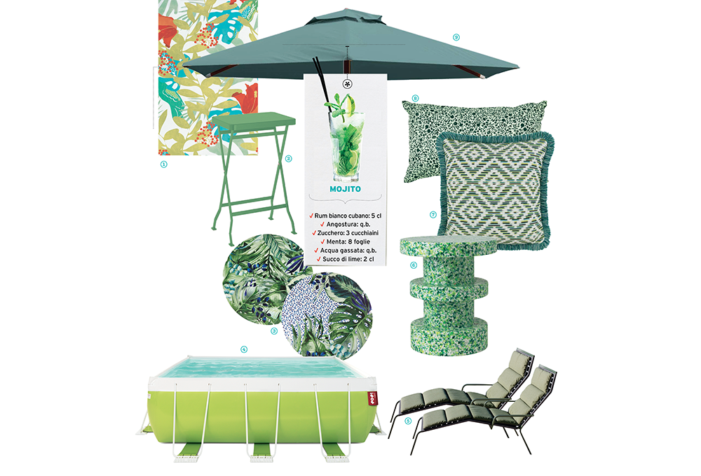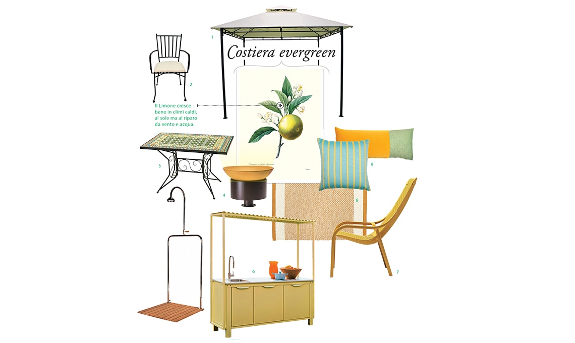 1 Gazebo Dual con doppio tetto, pali in acciaio e teli in poliestere écru [Conforama, cm 300x300x260h]. 2 Sedia Lina in metallo nero con cuscino écru incluso [Conforama, cm 51x47x91h]. 3 Tavolo Ginger in ferro nero con piano a mosaico multicolore [Conforama, cm 80x120x75h]. 4 Lampada da terra Bole in ferro, completato da vaso in terracotta per le piante [Il Fanale]. 5 Doccia Delta con base in teak e soffione vintage [Tectona, cm 90x90x235h]. 6 Cucina in acciaio verniciato a polvere giallo FadedYellow con top in materiale tecnico e lavello in acciaio [Very Simple Kitchen]. 7 Poltrona Net Lounge in polipropilene berglass, 100% riciclabile, con un profilo a onda [Nardi, cm 62x87,5x102h]. 8 Tappeto in pvc e poliestere Edit [Pappelina, cm 140x200]. 9 Cuscini Carré e Simple in azzurro e giallo [L’Opificio].
