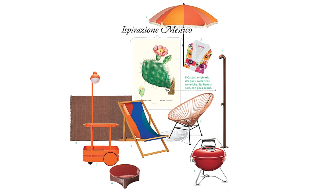 1 Ombrellone Streiff con palo in alluminio e baldacchino in poliestere con frange [Westwingnow, ø cm 220x238h]. 2 Accappatoio Galla Placidia, della collezione Gabel x Ken Scott, in spugna cimata stampata di puro cotone idrofilo [Gabel1967]. 3 Doccia Bold in acciaio inox finitura Corten con miscelatore Cross [CEA Design, cm 213,5h]. 4 Poltrona Acapulco con seduta in corda di pvc rosa [OK Design, cm 71x100x87h]. 5 Barbecue Smokey Joe Premium a carbone compatto e trasportabile, qui in rosso [Weber, ø cm 37]. 6 Tavolino basso Guna con top e base in Millgres rosso [Gervasoni, da ø cm 60x23h]. 7 Carrello Jolly in alluminio Tangerine con luce IP55 [Fatboy, cm 78x55x200h]. 8 Sdraio Panama in legno di eucalipto e tela multicolore [Maisons du Monde, cm 57,5x97x66h]. 9 Tappeto in fibra sintetica Maui [Warli, cm 200x300].