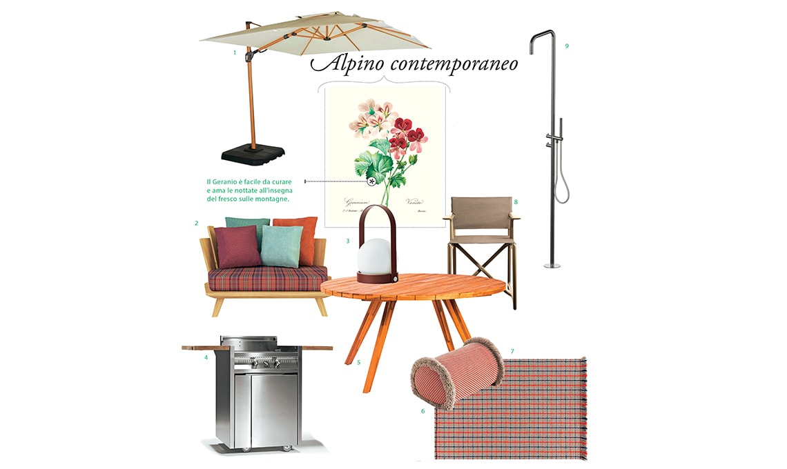 Sì, gli spazi all’aperto in montagna hanno uno stile tutto loro, fatto di fantasie tartan, legni caldi e... vasi di gerani. Gli arredi che abbiamo scelto lo reinterpretano con linee contemporanee. Il Geranio è facile da curare e ama le nottate all’insegna del fresco sulle montagne.