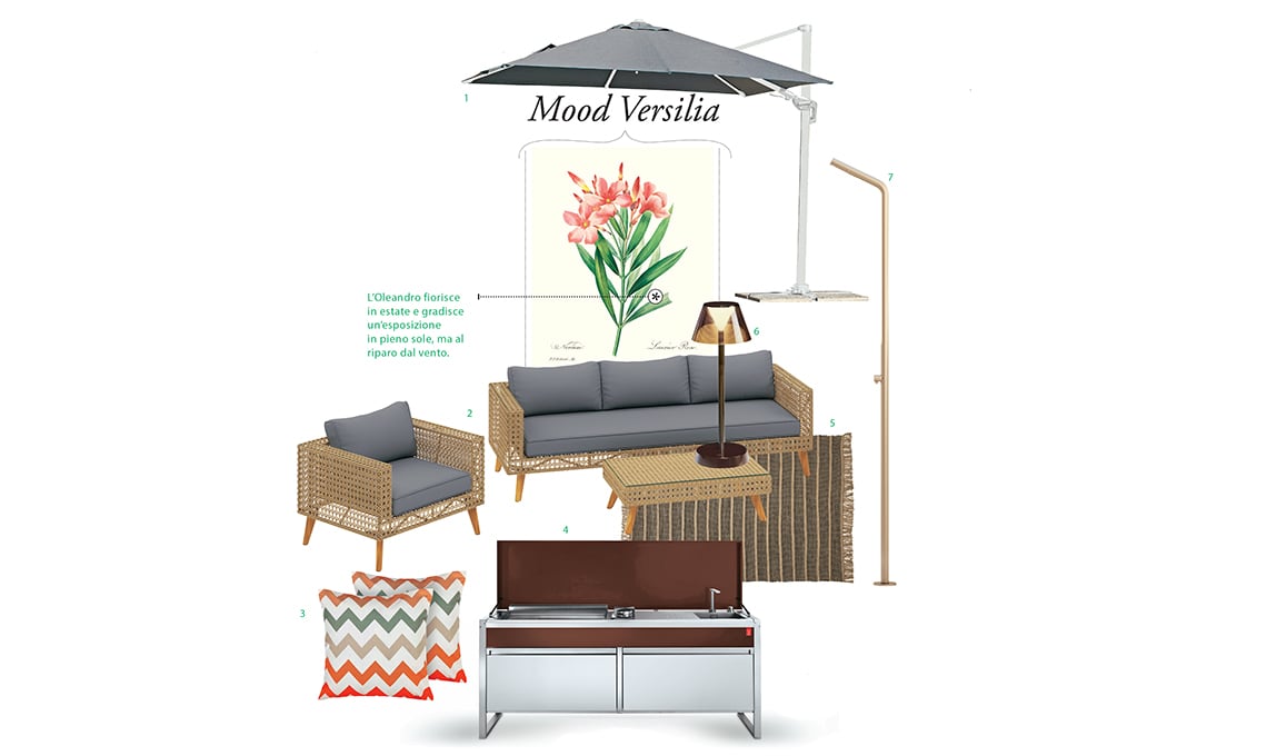 1 Ombrellone basculante decentrato e antivento con telo grigio e fusto bianco con maniglione di apertura [Obi, cm 300x300x263h]. 2 Set salotto formato da divano a tre posti, due poltrone e tavolino, tutto in rattan sintetico con gambe realizzate in legno d’acacia FSC in effetto teak chiaro. Cuscini inclusi [Obi]. 3 Coppia di cuscini Lagaro con decoro chevron multicolore [Beliani, cm 45x45]. 4 Cucina outdoor Oasi C5 in acciaio AISI304L e parti verniciate a polveri termoindurenti ad alta resistenza: il piano si organizza con sistemi cottura e lavaggio modulari in diverse combinazioni [Planet, cm 205x56x 88h]. 5 Tappeto Rubber Tube realizzato recuperando camere d’aria di biciclette [Karpeta, cm 170x240]. 6 Lampada wireless ricaricabile Lolita Coffee [Ideal Lux, ø cm 12,5x34,5h]. 7 Colonna doccia da esterno BD34210 in acciaio inox 316L [Guglielmi, cm 211h].