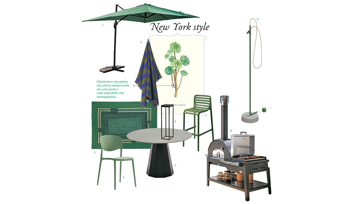 cm 100x150]. 3 Tappeto Disco in Pet riciclato proveniente da bottiglie di plastica post-consumo [Elitis, cm 180x250]. 4 Sedia Abby in polipropilene 100% riciclato [Connubia, cm 48x53x82h]. 5 Tavolo tondo Dix con base in lamiera [Connubia, ø cm 120x76h]. 6 Lampada Soon in alluminio, a ricarica solare [Rossini Illuminazione, da cm 14x14x32,5h]. 7 Sgabello Doga Stool in polipropilene berglass [Nardi, cm 51x51x98,7h]. 8 Kitchen Station Oreste con piastra cottura in pietra lavica, forno a legna, piani lavoro e vano per caricare la legna [Palazzetti, cm 170x83x260h]. 9 Doccia Ingiro con doccino orientabile e pedale di accensione/spegnimento [Fima Carlo Frattini, cm 225,5h].