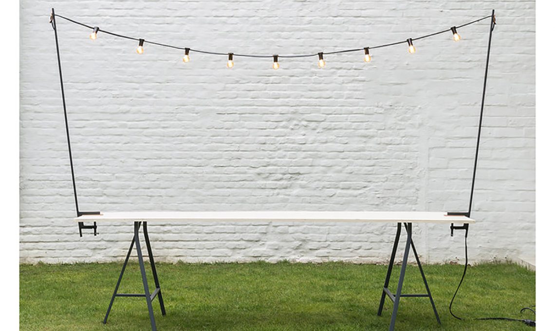 Ghirlanda di luci da esterno con supporto da tavolo autoportante [Studiomie, lunghezza massimo tavolo cm 240. Presto disponibile su http://www.studiomie.be].