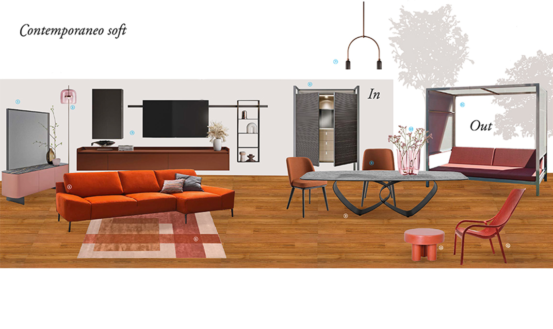 Parete Motus con basi in laccato opaco Ruggine, pensili in laccato opaco Grigio Ferro e barra in alluminio [Scavolini].