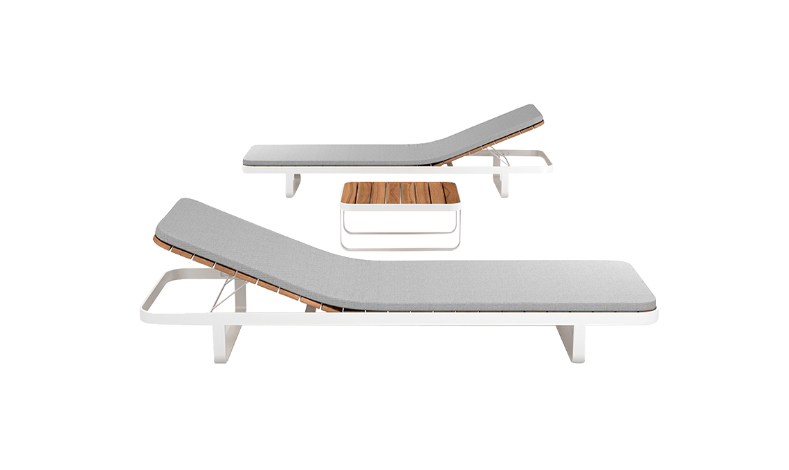Lettini in teak e alluminio laccato, collezione MakeMake [Déco, cm 70x205x70h € 2.160 cad].