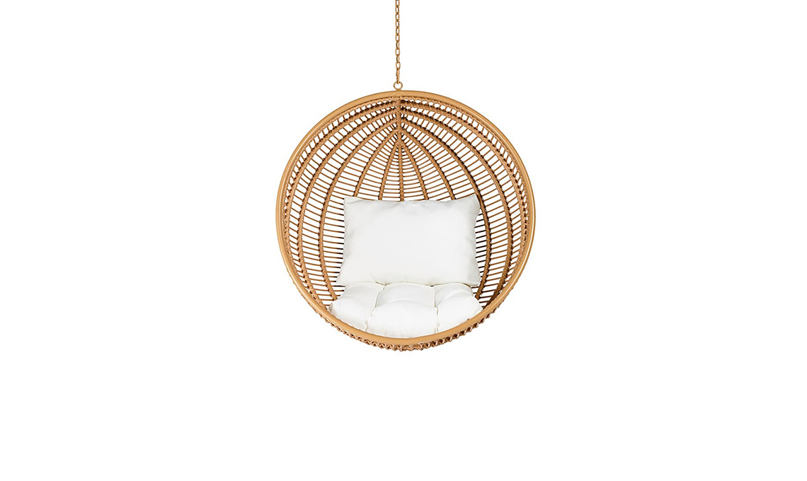 Dondolo in eucalipto e intreccio in corda resistente ai raggi UV, Thana [Kave Home, cm 69x74x76h € 359].