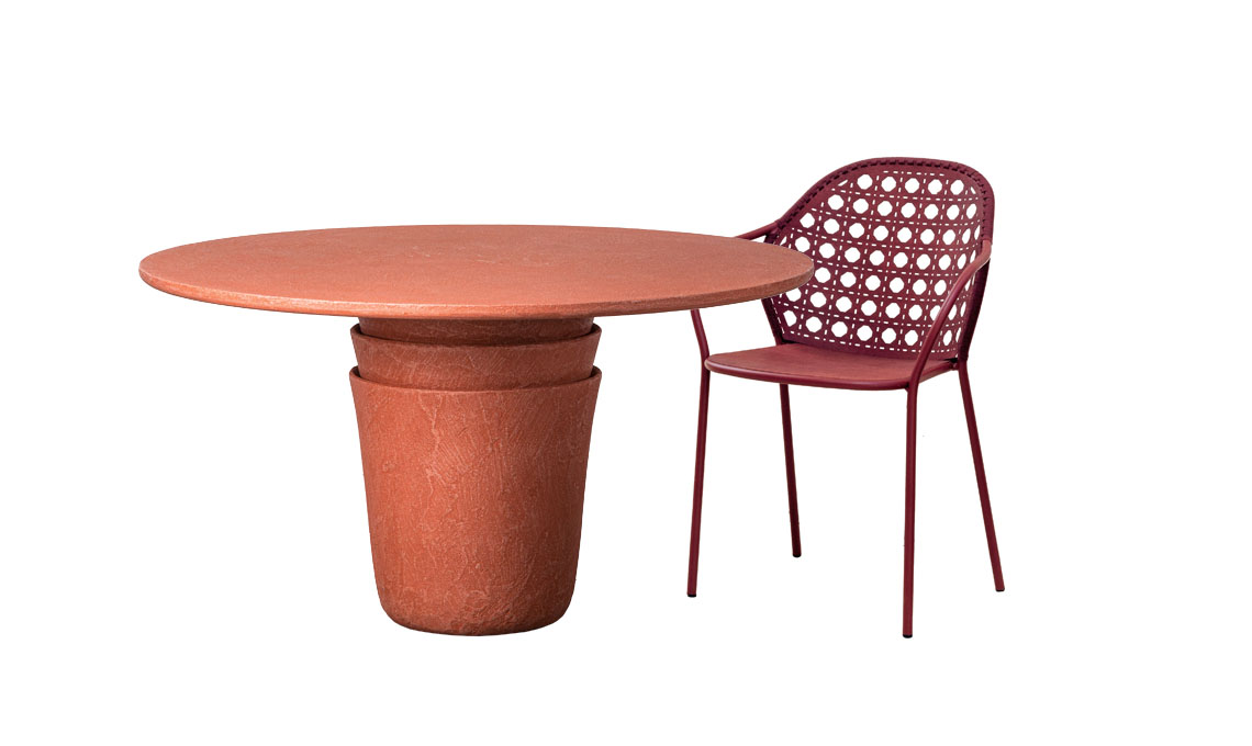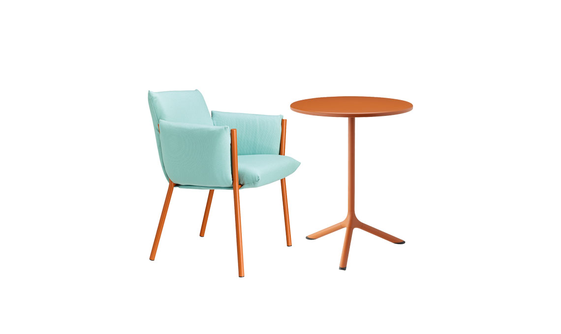 Tavolino Tripé in acciaio verniciato terracotta con poltroncina Brezza con imbottitura asportabile rivestita in tessuto di polipropilene riciclato (basta un gesto per sfoderare l’imbottitura e lavare o sostituire il rivestimento) [S.CAB, ø cm 60x73h e cm 62x55x79h]